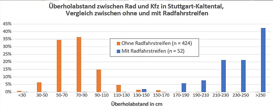 Durch die Einrichtung der Radfahrstreifen hat sich der durchschnittliche Überholabstand auf etwa 240 cm eingependelt. Nur selten wird der vorgeschriebene Sicherheitsabstand von 150 cm unterschritten. Das Radfahren ist also nicht nur spürbar, sondern messbar sicherer geworden – Radfahrende sind dort nun "mit Abstand" besser unterwegs.