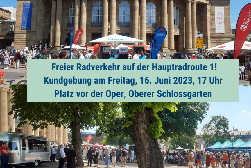 Freier Radverkehr auf der Hauptradroute 1! Kundgebung am Freitag, 16. Juni 2023, 17 Uhr, Platz vor der Oper, Oberer Schlossgarten