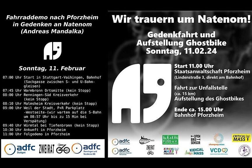 Der ADFC Stuttgart macht zusammen mit dem Zweirat und dem ADFC Renningen am 11. Februar eine Zubringerdemo von Stuttgart-Vaihingen nach Pforzheim zur dortigen Gedenkveranstaltung Natenom / Andreas Mandalka. Abfahrt ist 7 Uhr in Stuttgart-Vaihingen Bahnhof, dann Pause in Weil der Stadt bis 9 Uhr und danach weiter nach Pforzheim über das Würmtal.