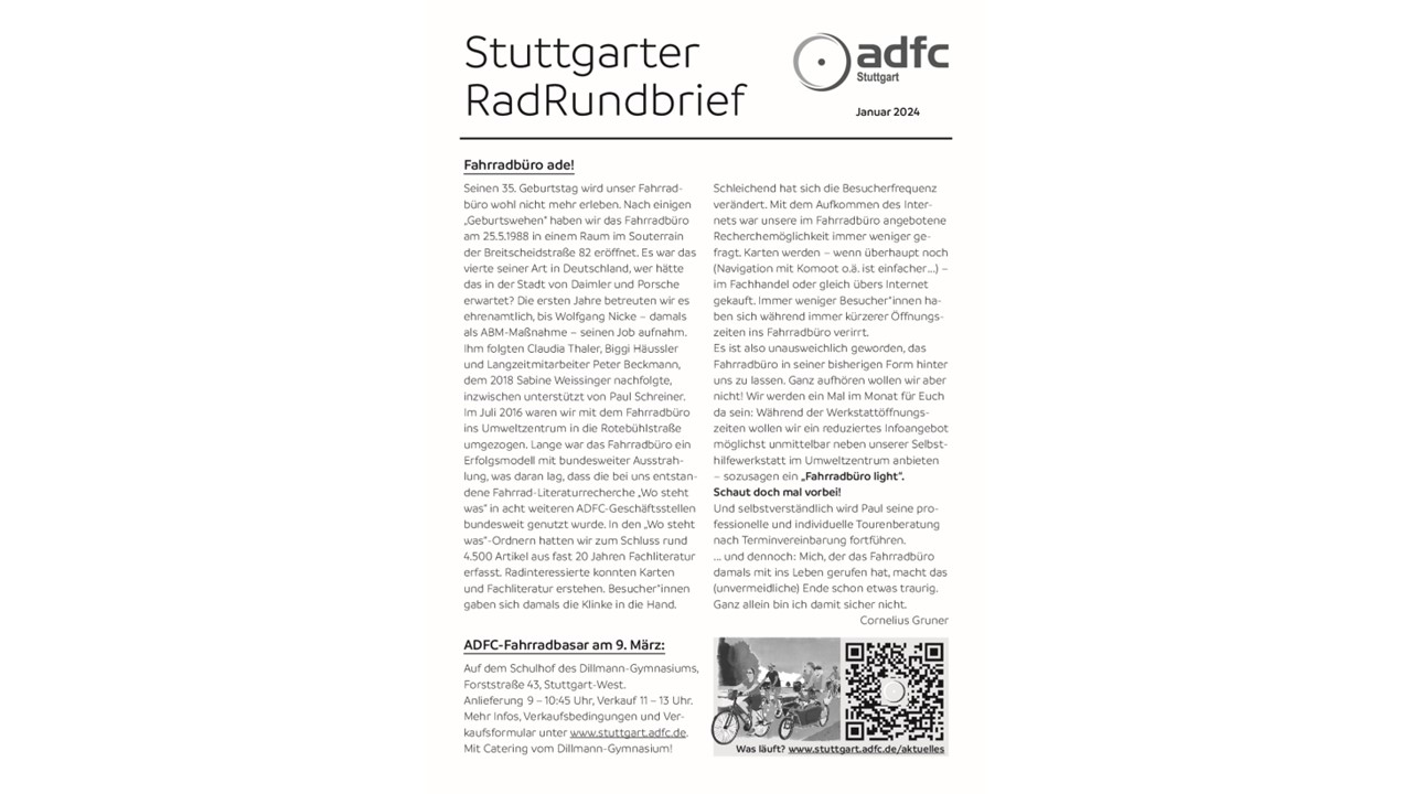 Bis 2024 haben wir den Stuttgarter RadRundbrief mehrmals pro Jahr in Papierform erstellt und an alle Mitglieder des Kreisverband verteilt. Alle Rundbriefe bis zum Jahr 2013 finden Sie hier archiviert zur Einsicht.
